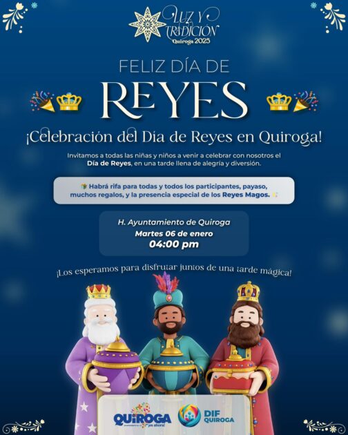 Quiroga, Michoacán a 5 de enero del 2026.-Con el objetivo de fomentar la convivencia familiar, fortalecer los valores y mantener vivas las tradiciones, el Gobierno de Quiroga, a través del DIF Municipal, invita a las niñas, niños y familias del municipio a participar en la Celebración del Día de Reyes.