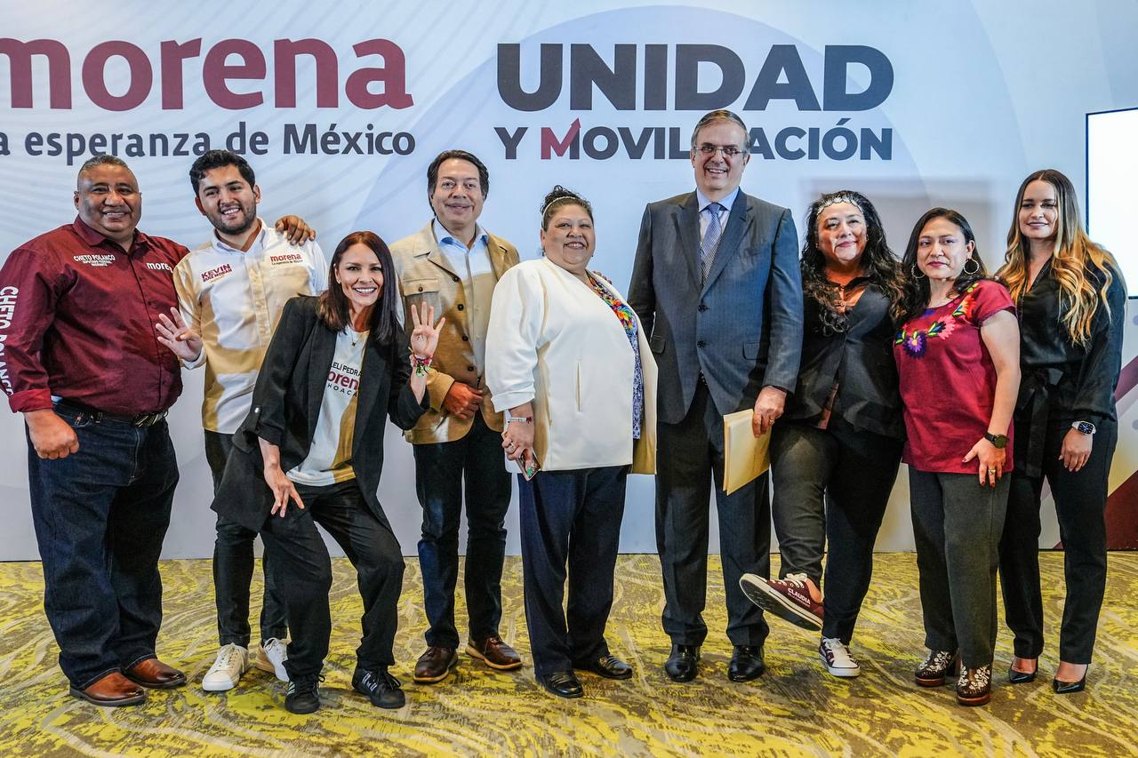 La candidata morenista y Secretaria de Mexicanas y Mexicanos en el Exterior del CEN Morena, junto con Marcelo Ebrard, representante de la próxima presidenta de México, Claudia Sheinbaum y del presidente Nacional Morena, Mario Delgado, presentaron ante periodistas, las y los candidatos a senadores y diputados migrantes, por la vía plurinominal, quienes en conjunto con los connacionales integrarán la agenda migrante 2024-2030.