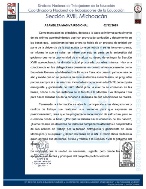 Además, las bases exigieron convocar en enero a una nueva asamblea y emitir un posicionamiento público para comunicar el sentir real del magisterio. También se acordó solicitar un Pleno Seccional de secretarios generales y representantes de centros de trabajo para definir la ruta de lucha, así como impulsar un Congreso Político con todas las delegaciones del estado.
