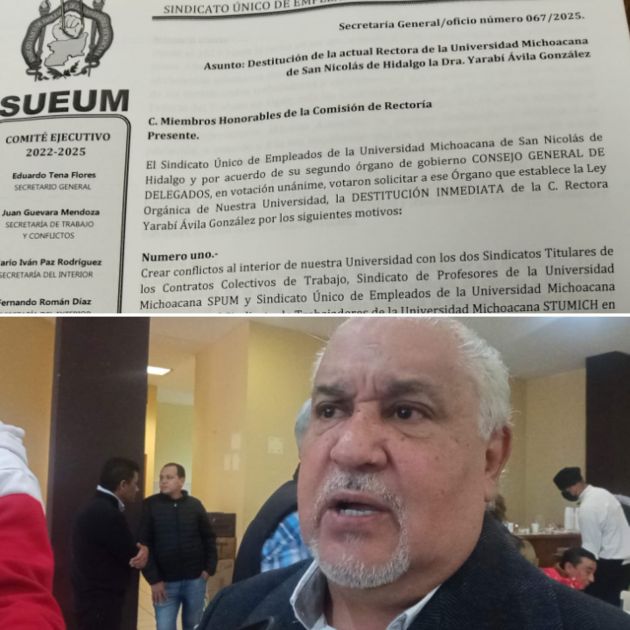 El Sindicato Único de Empleados de la Universidad Michoacana (SUEUM) entregó a los integrantes de la Comisión de Rectoría la solicitud para destituir a la rectora Yarabí Ávila González.