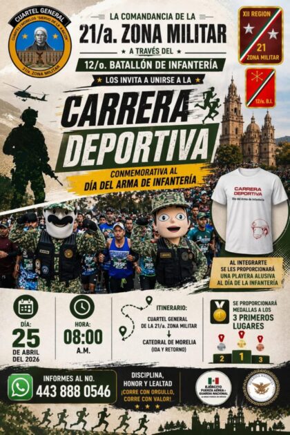 Morelia, Michoacán, a 19 de abril de 2026.— La Comandancia de la 21/a Zona Militar, a través del 12/o Batallón de Infantería, invita a la ciudadanía en general a participar en la Carrera Deportiva Conmemorativa del Día de la Infantería, a realizarse en la ciudad de Morelia, Michoacán.