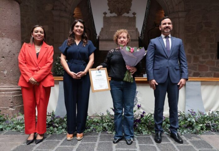 En Sesión Solemne de Cabildo llevada a cabo en el Palacio Municipal, la síndica Melissa Vásquez Pérez y el secretario del Ayuntamiento, Yankel Benítez Silva, junto con la secretaria de la Mujer Moreliana para la Igualdad Sustantiva, Nuria Hernández Abarca, hicieron entrega del galardón a nombre del gobierno de Alfonso Martínez.