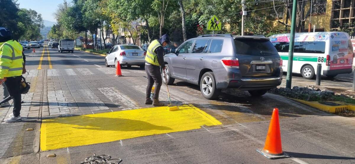 El equipo especializado de CEBRAS de la SEDUM está realizando un balizamiento integral, que incluye la demarcación de cruces escolares, pasos peatonales, flechas de sentido, señales de velocidad, líneas de alto y divisorias de carriles. Estas mejoras contribuirán a aumentar la visibilidad y la seguridad tanto para peatones como para conductores.