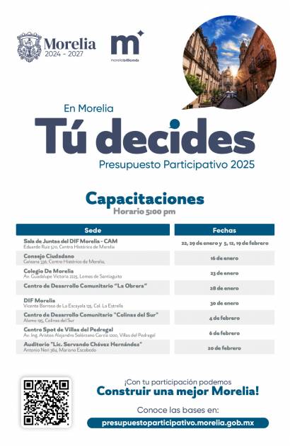 Morelia, Michoacán; 16 de enero de 2025. Con el objetivo de seguir recibiendo una gran e informada participación de parte de la ciudadanía, el Gobierno del Presidente Municipal de Morelia, Alfonso Martínez Alcázar, invita a morelianas y morelianos a formar parte de las capacitaciones del Presupuesto Participativo 2025.