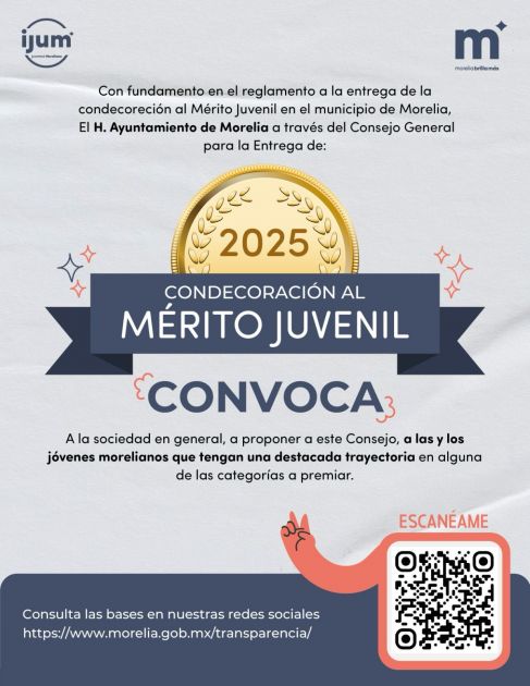 Morelia Michoacán; 07 de abril de 2025.- La administración del presidente municipal de Morelia, Alfonso Martínez Alcázar, invita a las y los jóvenes a participar en la “Condecoración al Mérito Juvenil 2025”, que tiene el fin de reconocer las importantes aportaciones de este sector poblacional y seguir fomentando su labor en beneficio de la ciudad.