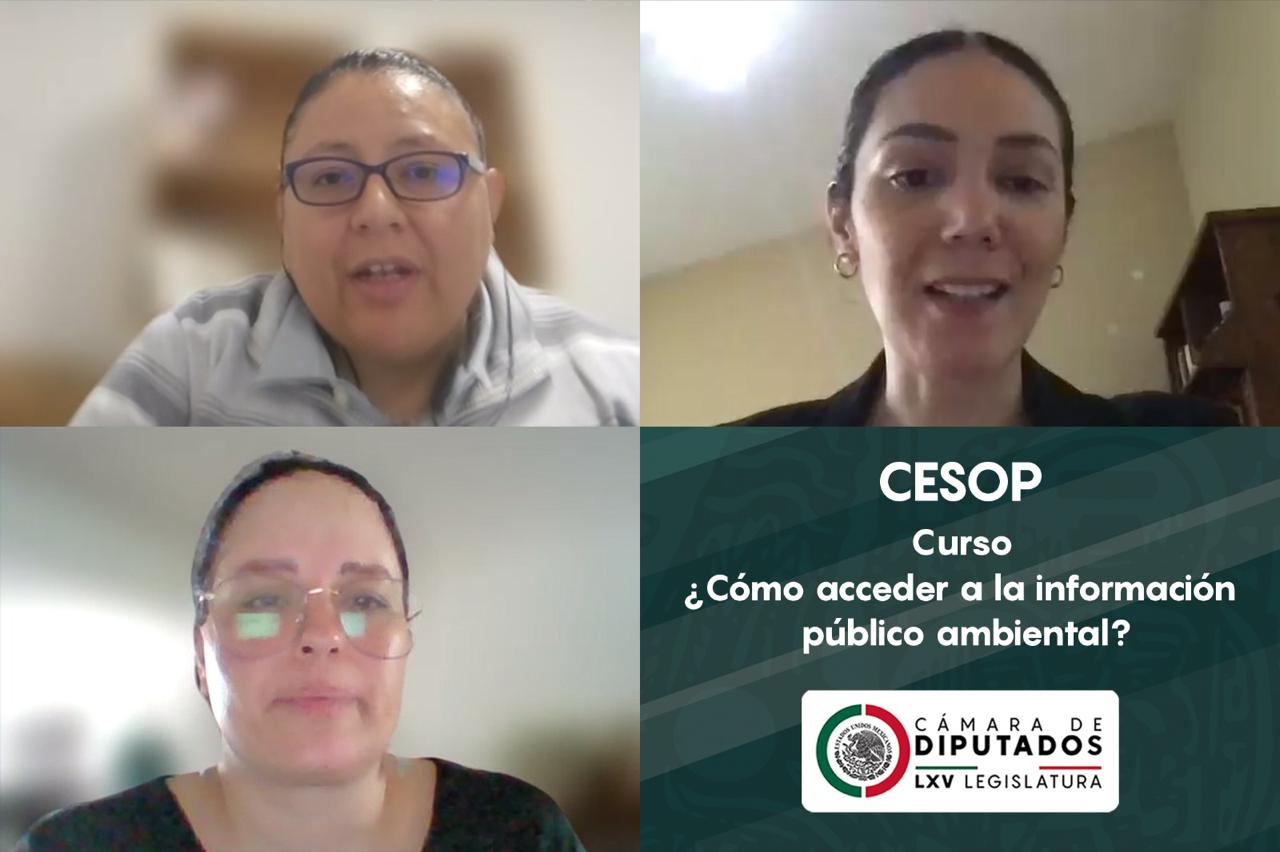 El Centro de Estudios Sociales y de Opinión Pública (CESOP), que dirige la maestra Ana Gabriela Núñez Pérez, realizó el curso virtual “¿Cómo acceder a la información pública ambiental?”, impartido por la maestra Alya Ramos Ramos Elorduy, con la finalidad de que los participantes sean capaces de realizar búsquedas de información pública en esta materia y discernir de aquellas fuentes no oficiales.