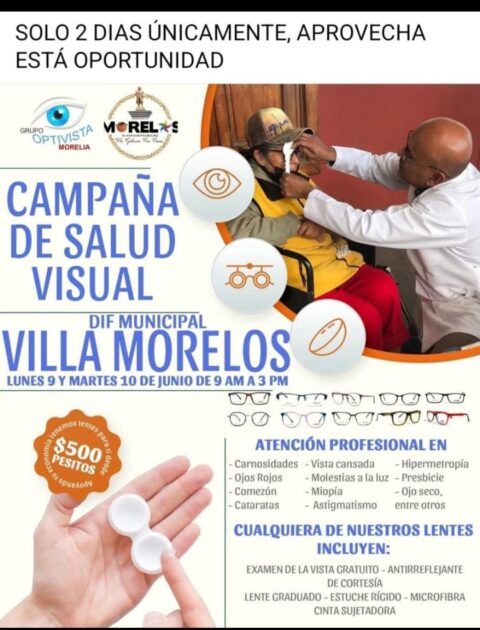 Villa Morelos, Michoacán, a 9 de junio 2025.- Con el firme compromiso de mejorar la salud visual de los morelense, el presidente municipal, Julio César Conejo Alejos, anunció la Campaña de Salud Visual que se realiza del 9 al 10 de junio, gracias a la coordinación del Sistema DIF Municipal y el Grupo Optivista Morelia.