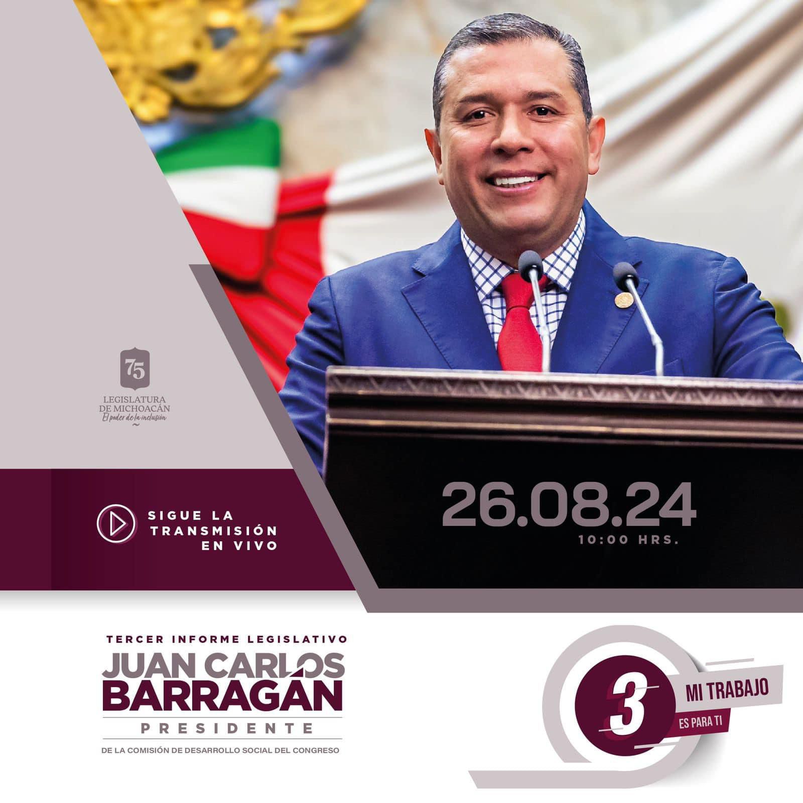 Morelia, Michoacán, a 25 de agosto de 2024.- El diputado Juan Carlos Barragán Vélez, presentará este lunes 26 de agosto a las 10:00 horas su Tercer Informe Legislativo, que por segunda ocasión lo hará de manera virtual.