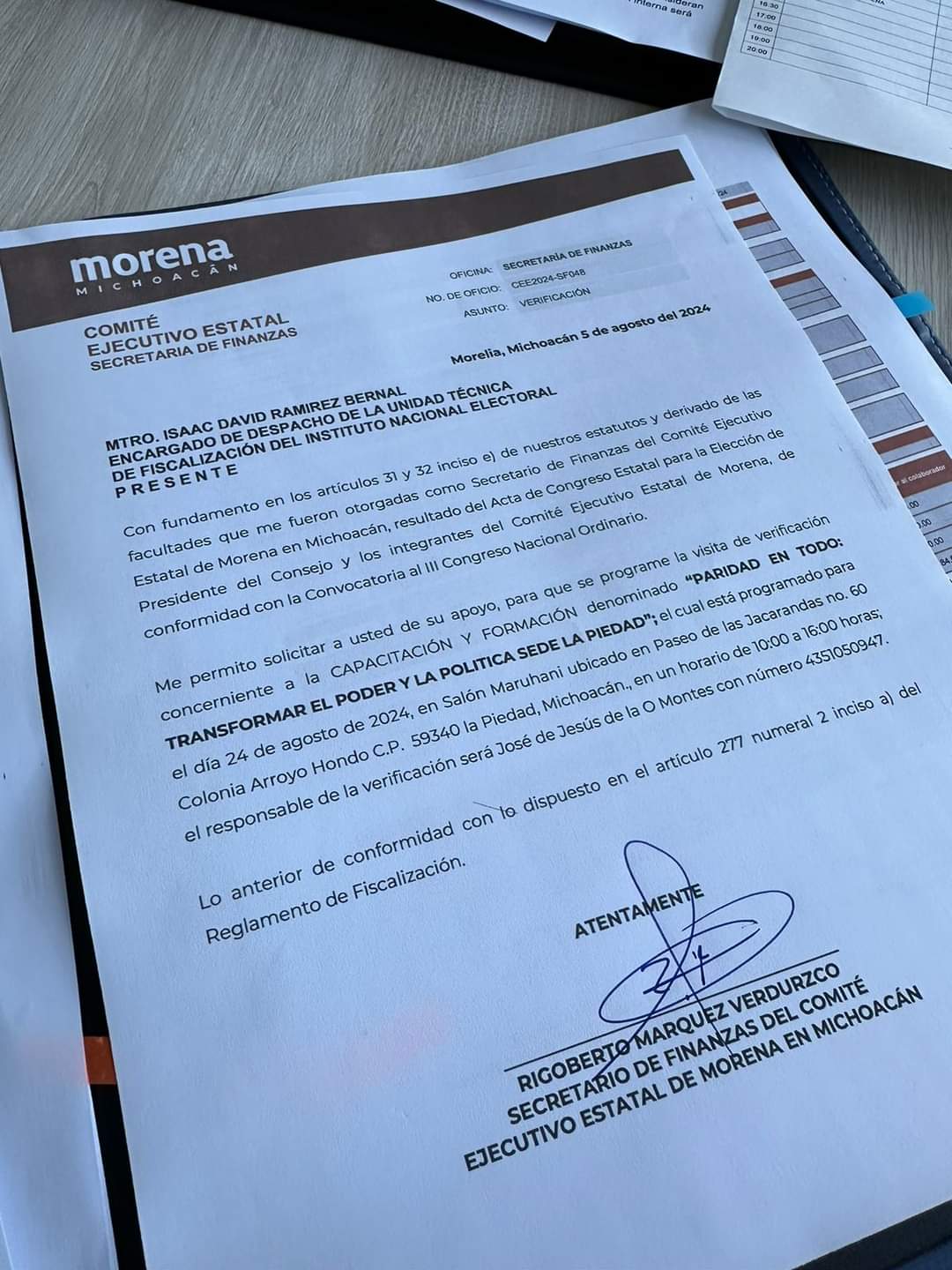 Morelia Michoacán a 6 de agosto de 2024.- Rigoberto Márquez, Secretario de Finanzas de Morena en Michoacán, ha anunciado la firma oficial para la realización del evento “Paridad en Todo: Transformar el Poder y la Política”, programado para el 24 de agosto en La Piedad. Este evento, liderado por Mireya Aguilar, Secretaria de la Mujer, representa un esfuerzo significativo para abordar la paridad de género y promover cambios transformadores en las estructuras de poder político de la región.