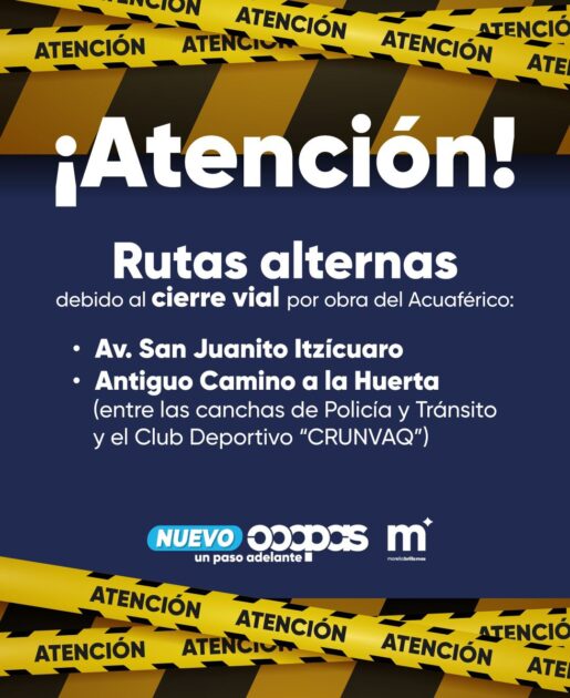 El tránsito vehicular se verá restringido durante las labores, por lo que se recomienda a las y los automovilistas anticipar sus traslados y emplear las siguientes rutas alternas: Avenida San Juanito Itzícuaro y el Antiguo Camino a La Huerta (entre las “canchas de Policía y Tránsito” y el Club Deportivo “Crunvaq”).