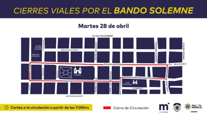 Con motivo del 485 aniversario de la fundación de Morelia, este martes 28 de abril se realizarán cortes a la circulación en el primer cuadro del Centro Histórico por la ceremonia del recorrido en Bando Solemne, para la develación de la programación de actividades.