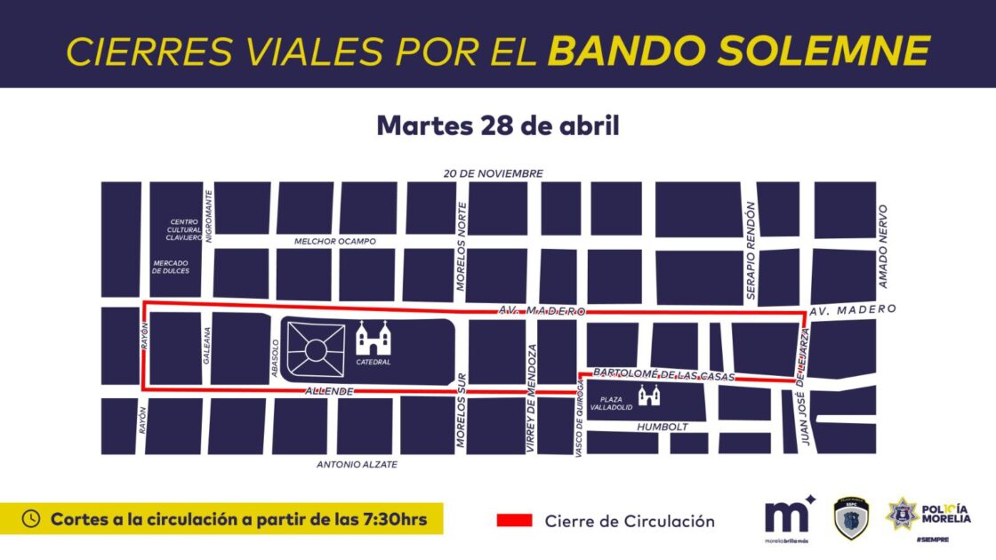 Los cierres viales iniciarán a partir de las 7:30 horas y contemplan las siguientes vialidades: Av. Madero, Allende, Abasolo, Rayón, Bartolomé de las Casas y Juan José de Lejarza, en el perímetro que comprende Catedral y Plaza Valladolid.