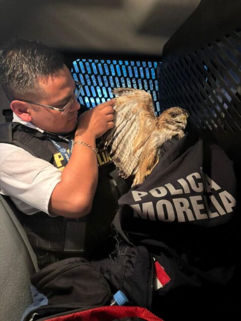 Morelia, Michoacán, a 25 de junio de 2025.- Elementos de la Policía Morelia rescataron a un ejemplar de halcón cola roja que presentaba signos de estrés y desnutrición en la colonia San José Itzícuaro, luego de atender un reporte ciudadano.