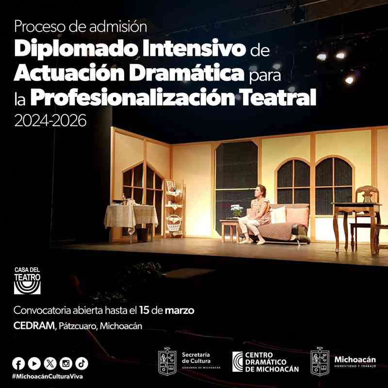 Asimismo, al Diplomado Intensivo de Actuación Dramática para la Profesionalización Teatral Generación 2024-2026, que se llevarán a cabo en el Centro Dramático de Michoacán.