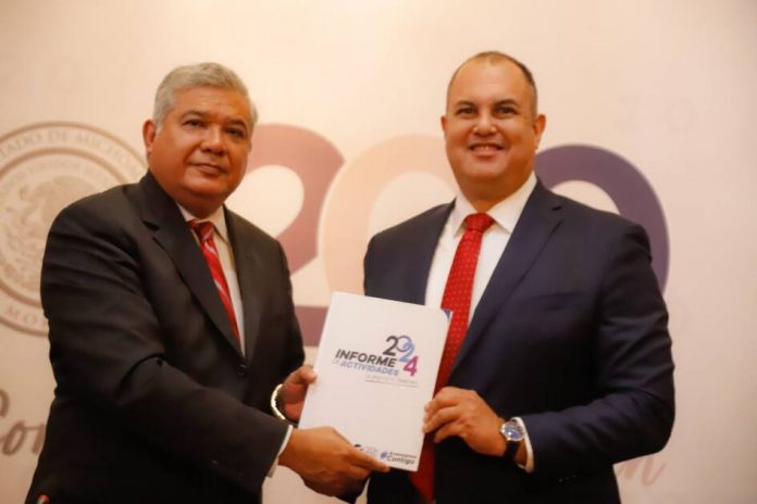 Morelia, Michoacán, a 25 de septiembre del 2024.- El diputado Juan Antonio Magaña de la Mora, presidente de la Mesa Directiva del Congreso del Estado, recibió el informe de actividades, que comprende de septiembre de 2023 a julio de 2024, de la Comisión Estatal de Derechos Humanos (CEDH).