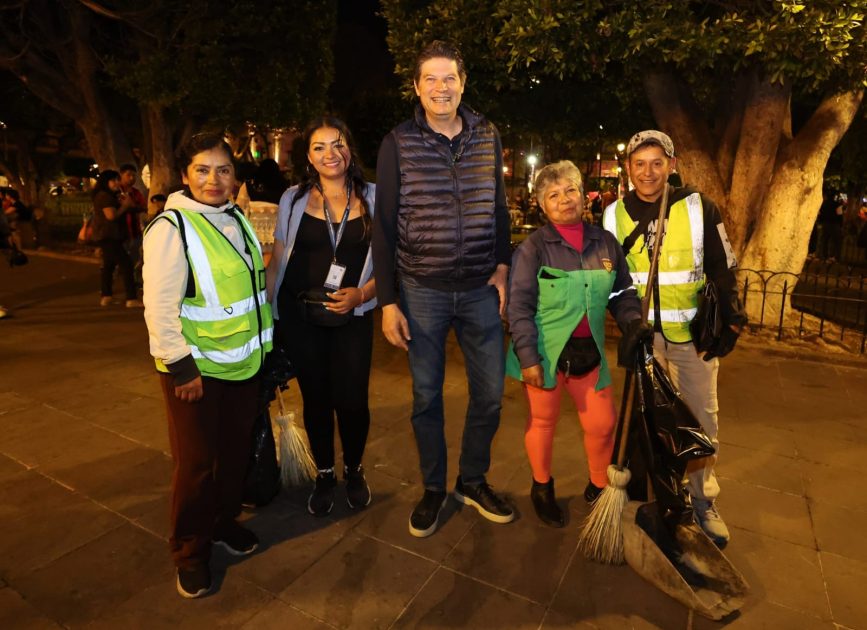 En recorrido por el Centro Histórico, el alcalde Alfonso Martínez saludó a una brigada de limpia de la Secretaría de Servicios Públicos, que se encontraban trabajando arduamente en la Plaza de Armas.