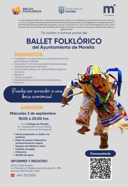 Morelia, Michoacán; 26 de agosto de 2025.- El Gobierno de Morelia que encabeza el presidente municipal, Alfonso Martínez Alcázar, por medio de su Secretaría de Cultura (SeCultura) invita a personas de entre 17 y 29 años a sumarse al Ballet Folklórico del Ayuntamiento, con el objetivo de la administración por promover y fomentar la cultura, las tradiciones mexicanas y la danza.