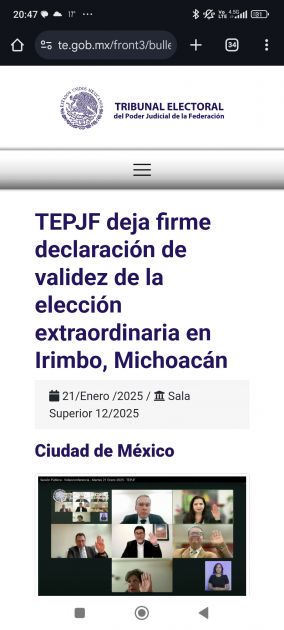 La Sala Superior del Tribunal Electoral del Poder Judicial de la Federación (TEPJF), por unanimidad de votos, desechó el recurso de reconsideración contra la resolución de la Sala Regional Toluca dictada en el juicio ST-JRC-1/2025, relacionado con el resultado de la elección extraordinaria del ayuntamiento de Irimbo, Michoacán, porque no se actualizan los requisitos legales o jurisprudenciales de procedibilidad.