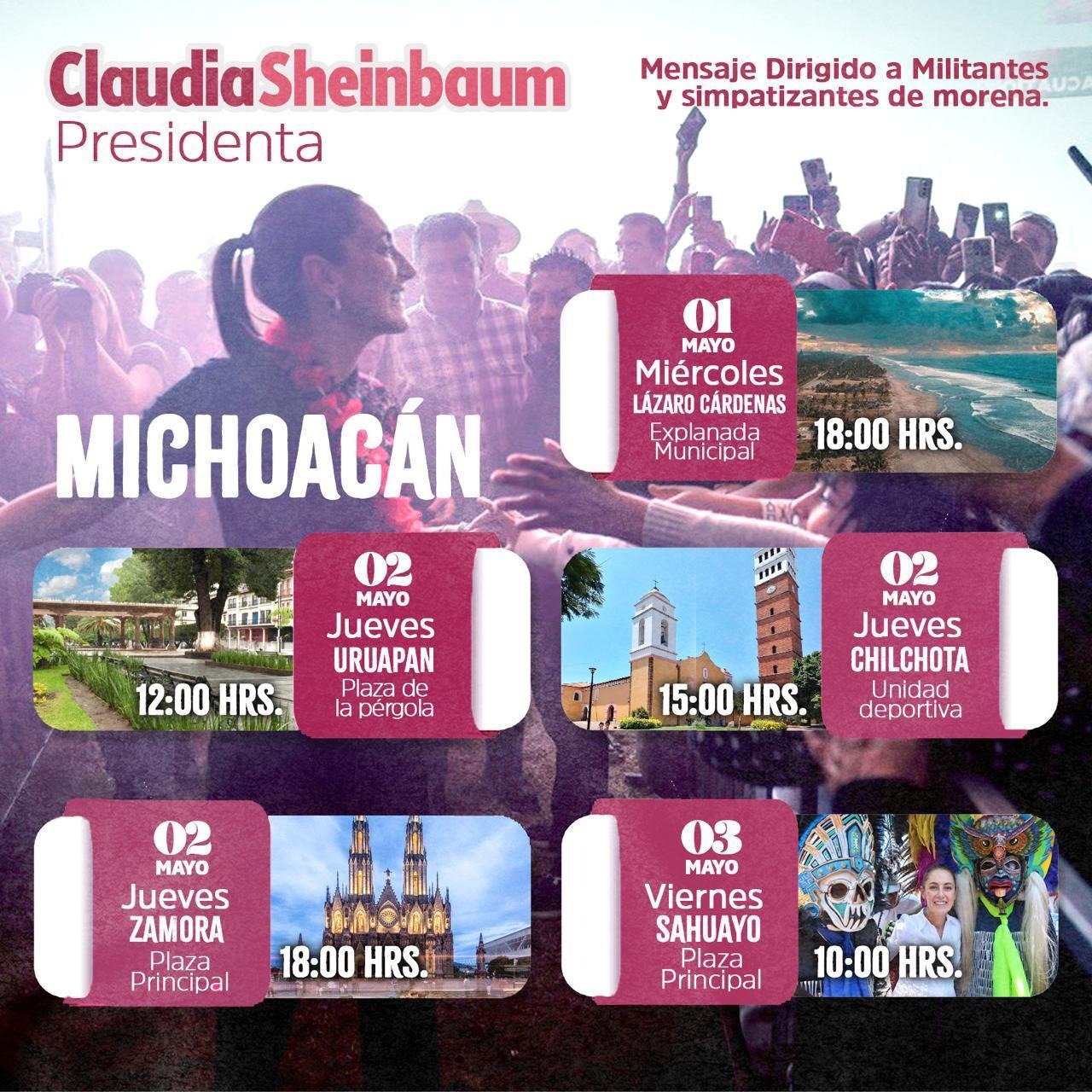 Claudia Sheinbaum, en esta ocasión, en tres días, visitará Lázaro Cárdenas, Uruapan, Chilchota, Zamora y Sahuayo, municipios donde encabezará mítines y reuniones para dar a conocer sus propuestas y escuchar a la gente, detalló.