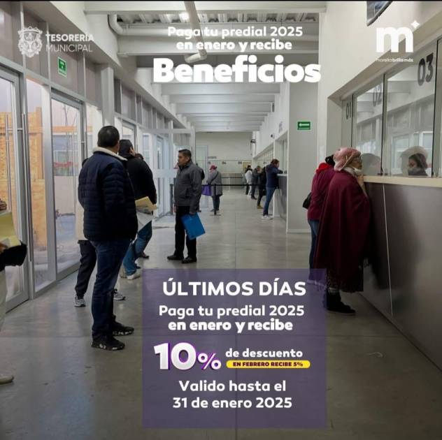 Morelia, Michoacán; 27 de enero 2025.- El Gobierno de Morelia que encabeza el Alcalde, Alfonso Martínez Alcázar, invita a la ciudadanía a aprovechar los últimos días del 10 por ciento de descuento en el pago del predial 2025, beneficio que estará disponible hasta al 31 de enero.