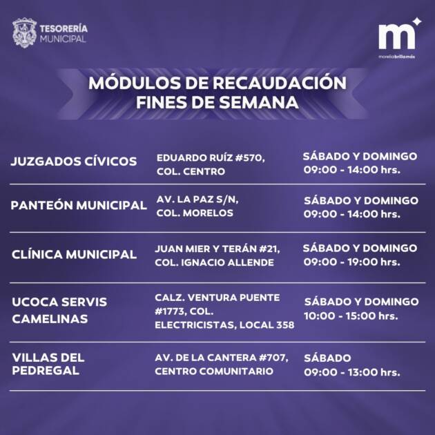Morelia, Michoacán; 21 de febrero de 2025.- A unos días de concluir la promoción, el Ayuntamiento de Morelia invita a la ciudadanía a aprovechar el descuento de 5% en el pago del predial 2025, acercándose al Centro Administrativo de Morelia (CAM), o a los módulos de recaudación, tanto en la mancha urbana como en las tenencias.